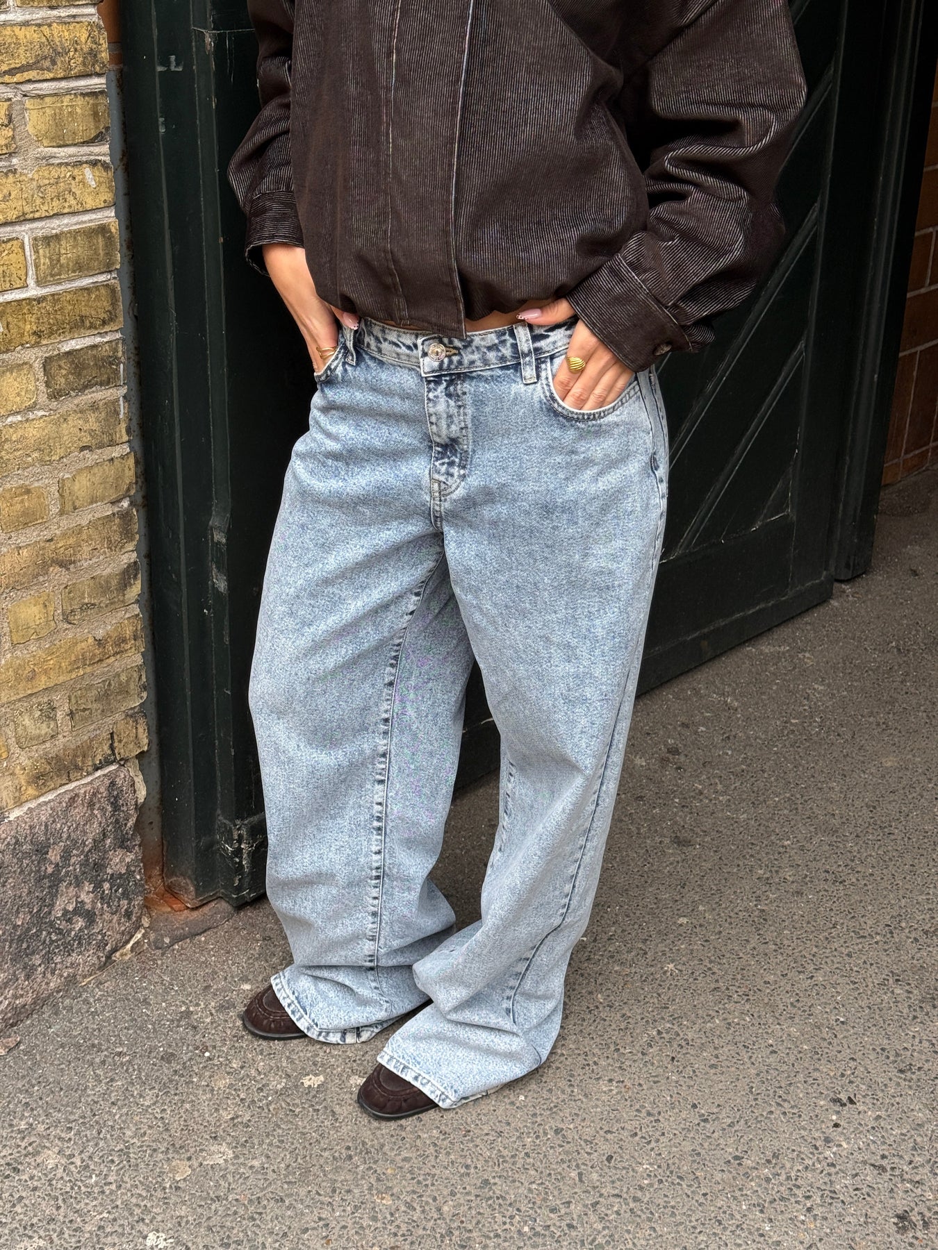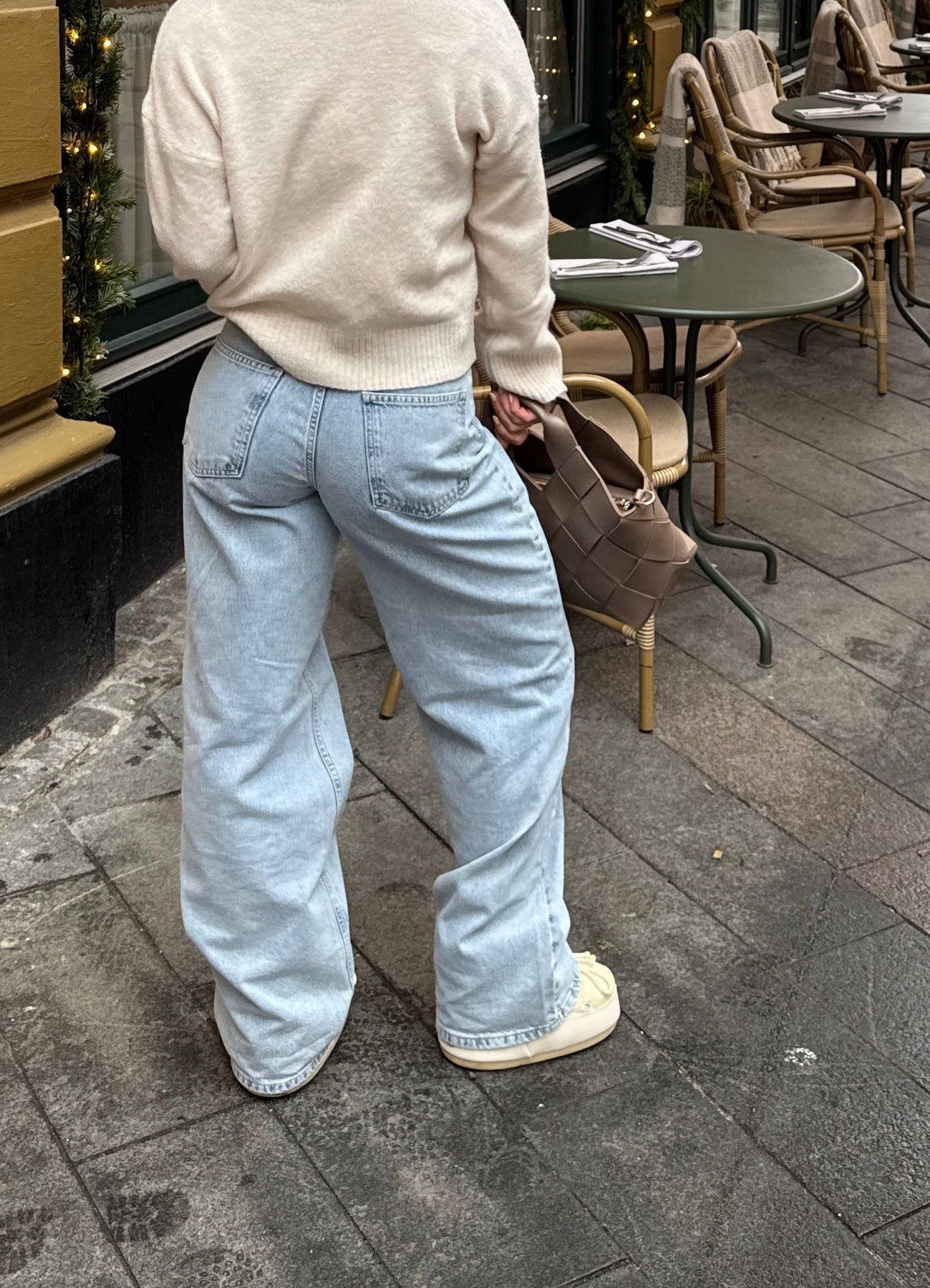 Nämä vaaleansiniset farkut ovat ehdoton hankinta jokaiseen vaatekaappiin. Rento, väljä istuvuus ja klassinen farkkupesu yhdistävät viileän katumuodin ja ajattoman tyylin. Korkea vyötärö ja leveät lahkeet luovat imartelevan ja modernin leikkauksen, joka sopii täydellisesti sekä arkeen että juhlavampiin asuihin. Yhdistä ne yksinkertaisen topin ja neuletakin kanssa luodaksesi rennon ja vaivattoman asun.