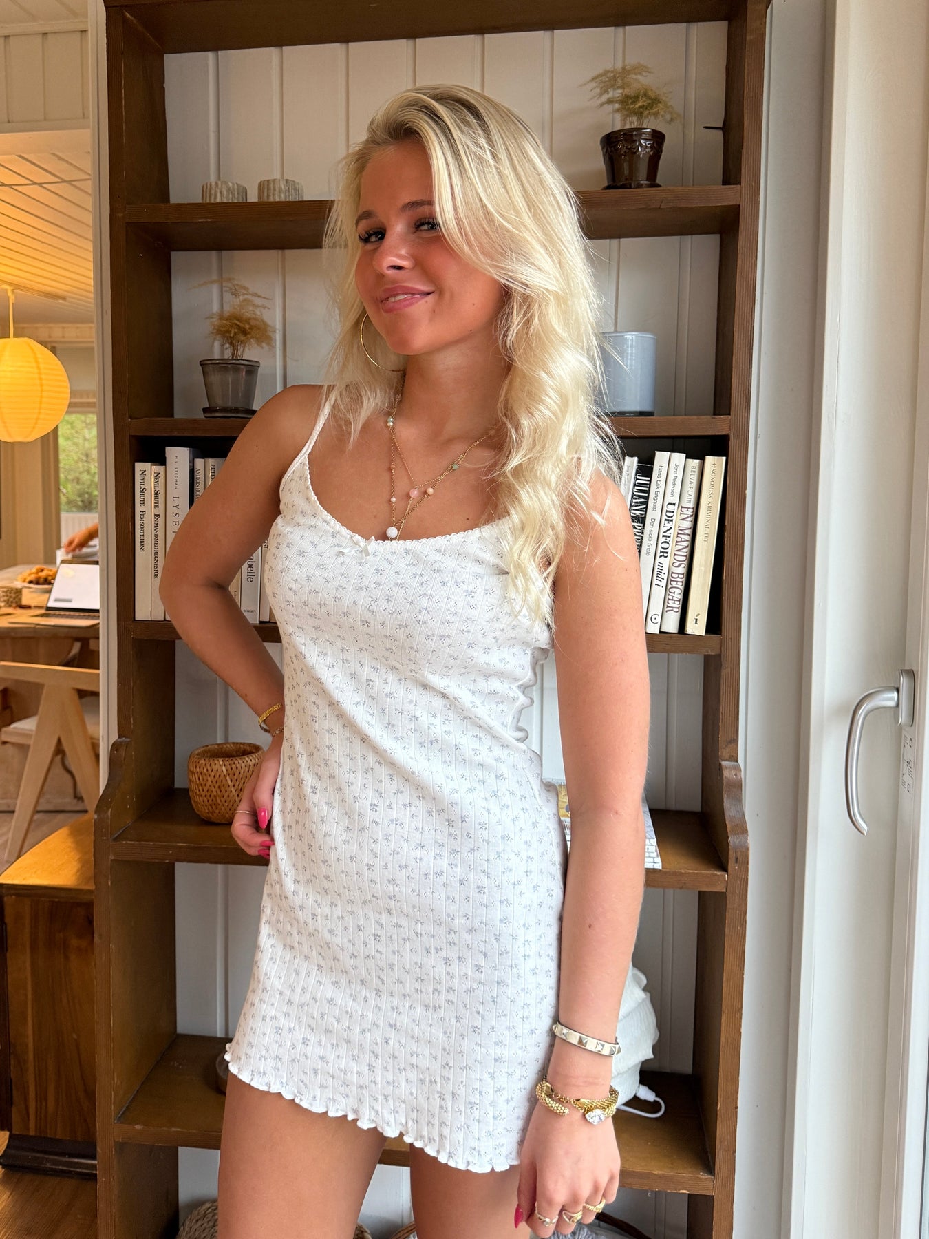 Tämä kaunis minimekko yhdistää mukavuuden ja tyylin. Pehmeästä ja kevyesti kuvioidusta kankaasta valmistettu mekko imartelee vartaloa luonnollisella ja elegantilla tavalla. Ohuet olkaimet ja pieni rusettiyksityiskohta edessä tuovat naisellisen ja romanttisen lisän, kun taas kevyesti röyhelöinen helma luo leikkisän viimeistelyn.