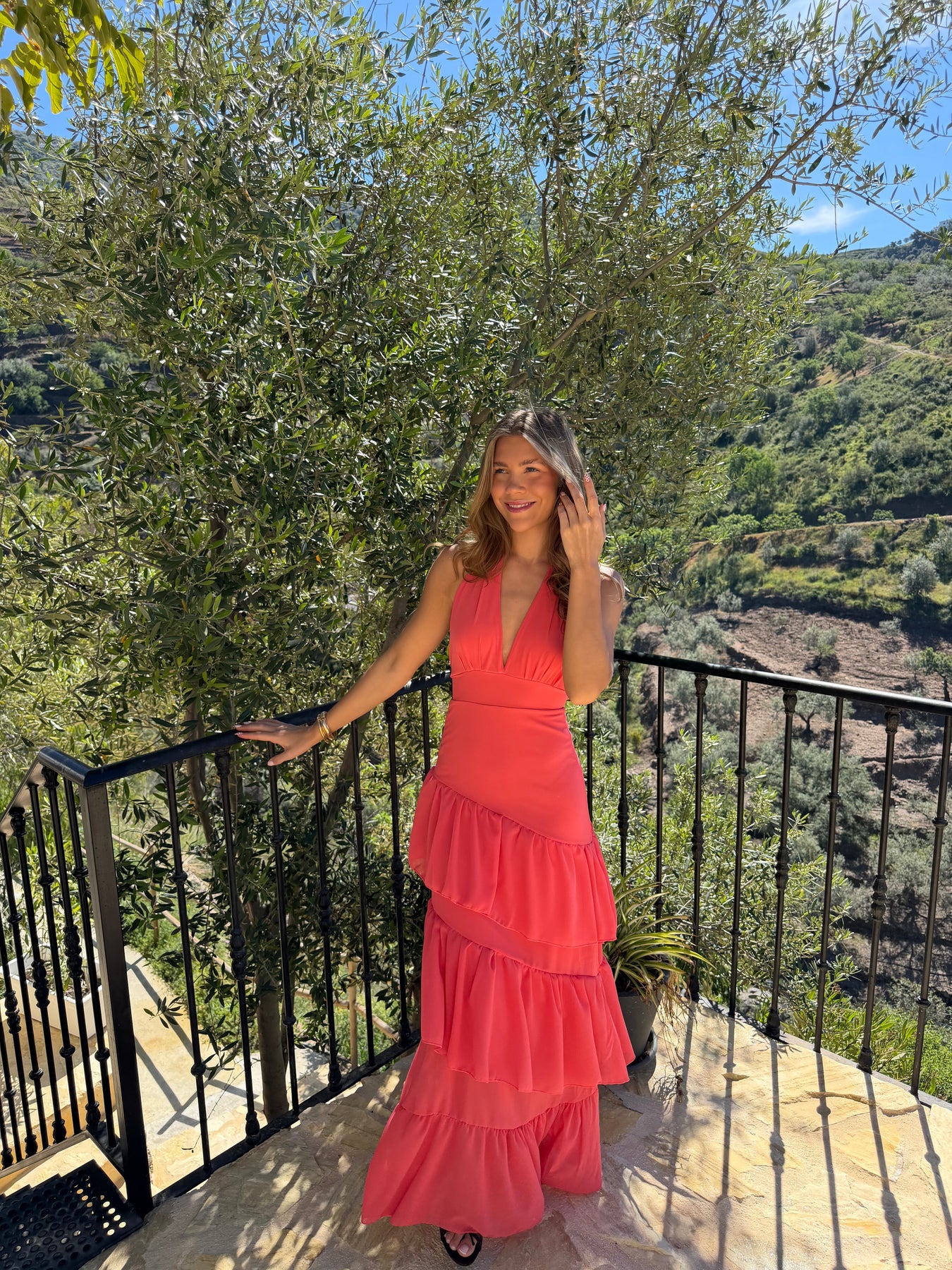 The Hailey Maxi Ruffle Dress is an elegant maxi dress with feminine ruffle details and a beautiful drape. The dress is fitted along the body and falls softly into ruffles.
