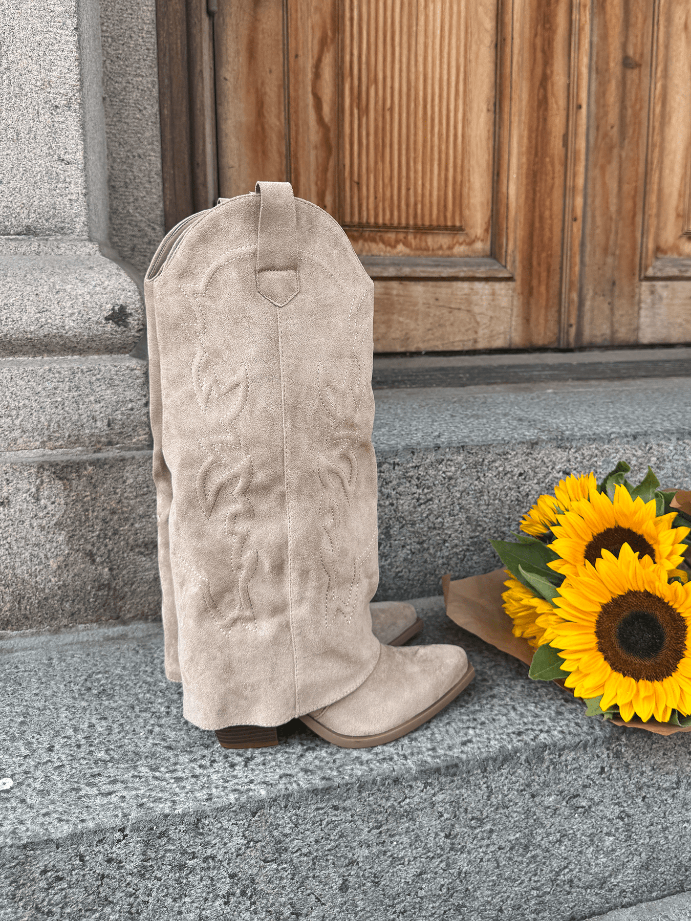 Katrine Faux Suede Boots - Taupe ovat länsimaiset saappaat tekonahkajäljitelmästä, hienovaraisilla tikkauksilla ja terävällä kärjellä. Niissä on raaka mutta yksinkertainen tyyli, ja ne sopivat niin arkeen kuin juhlaankin. Hihnat helpottavat pukemista ja riisumista, ja pehmeä pinta antaa rennomman ilmeen kuin klassinen nahkaversio.