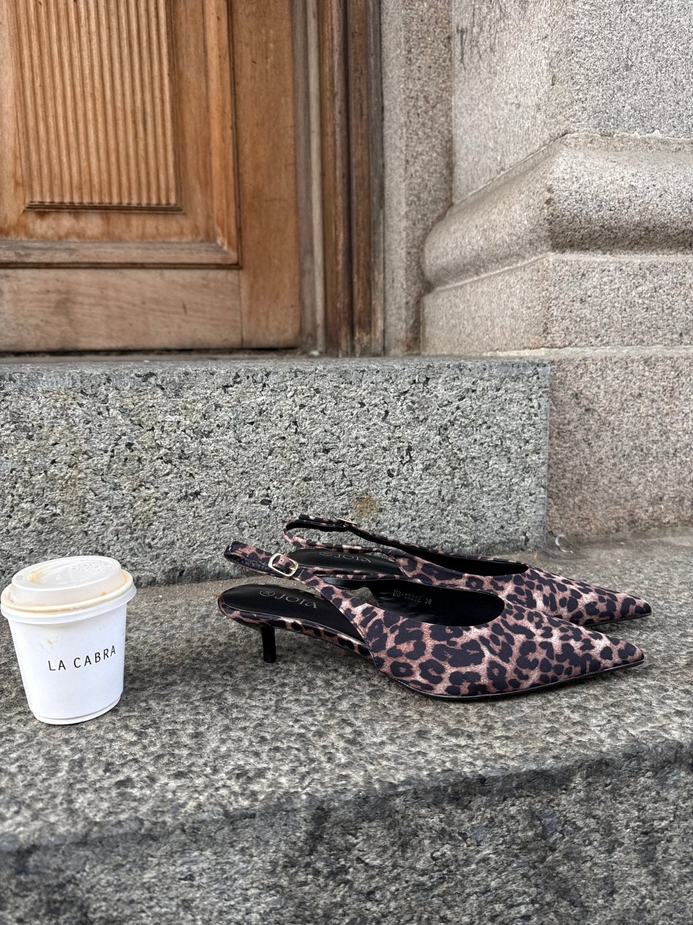 Thyra Slingback on tyylikäs, teräväkärkinen korkokenkä matalalla piikkikorolla. Kengässä on trendikäs leopardikuvio, joka antaa sille rohkean ja tyylitietoisen ilmeen.